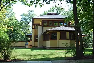 Wright submitted an initial plan which had porches at the extremities, but Adams rejected it as too costly. Adams approved of a second draft, which removed the south porch and made the dining room an open view and the house reflects this design.[4] An interesting feature of the building is its diagonal corner buttresses which are not structural, but serve to dramatically emphasize the extension of the roof. The exterior is stucco with cypress wood trim and the interior wood is southern yellow pine with quarter-sawn white oak floors. The original tan Roman brick fireplace has been restored. Wright designed a small storage building for the house which has also been restored. The house had rooms for a maid and servant. It was designed with a call system so that Adams could request help from anywhere in the house, even the porch.[5] The building sits on a corner lot, four houses from Lake Michigan. It is reminiscent of what would become Wright's A Fireproof House for $5000 design.