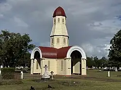Like most nineteenth century cemeteries, the Maryborough Cemetery was designed on a grid plan with burial areas used by various religious denominations separated by lanes and walkways. At the intersection of two principal tree-lined lanes, a mortuary chapel was placed to provide shelter for family and friends of the deceased attending grave side services. This unusual building was designed by Queensland architect Willoughby Powell and constructed by Bundaberg firm Clement and Sons at a cost of £534 in 1883–84. Occasionally mortuary chapels were constructed for one denomination and placed in their section of the cemetery, but this centrally placed chapel served all denominations, the four entrances ensuring that each of the surrounding religious sections had equal access and ownership of the small chapel. The entrances are large to permit entry of a horse-drawn hearse. Its position at the intersection of the cemetery lanes and its height make it a landmark and its tower form has caused it to be locally known as "the rocket".[1]