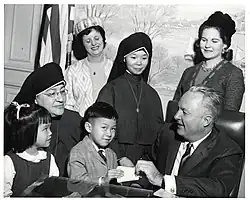 ![]() Two Maryknoll Sisters with John F. Collins, mayor of Boston, in the 1960s | |