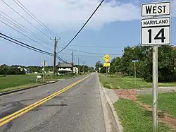 MD 14 begins at an intersection with MD 16 (Mt. Holly Road) a short distance west of East New Market. The state highway heads north as two-lane undivided Secretary Road in a straight line before curving to the east and crossing the Warwick River, where the highway's name changes to Main Street and the route enters the town of Secretary. MD 14 intersects Poplar Street, which leads to the suicide bridge over Cabin Creek, before leaving the town.[2] The state highway's name changes to Secretary East New Market Road as the road turns southeast toward the town of East New Market. MD 14 passes through East New Market on Academy Road and Railroad Avenue, with the name change occurring at the center of town at the highway's second intersection with MD 16, known at this point as Main Street. After intersecting MD 392 (East New Market Bypass) and crossing the Seaford Line of the Maryland and Delaware Railroad at-grade, MD 14 leaves the town limits of East New Market.[1][3]
