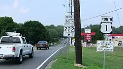 Maryland Route 222 Truck was a signed 12.49-mile (20.10 km) truck bypass of MD 222 from MD 222 in Perryville to US 1 and US 222 in Conowingo.[1] The signed route followed MD 275 from MD 222 in Perryville north to MD 276 in Woodlawn. MD 222 Truck continued north on MD 276 from Woodlawn north to US 1 west of Rising Sun. The truck route then headed west on US 1 (in a wrong-way concurrency) to US 222's southern terminus in Conowingo.[1][31] MD 222 Truck was first signed by 2002.[32] Signs for MD 222 Truck were removed by 2016 and replaced with signs directing trucks to I-95 and US 40 southbound and to US 222 northbound.[31]