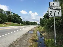 Maryland Route 277 (MD 277) is a state highway in the U.S. state of Maryland. The highway runs 2.51 miles (4.04 km) from Elk Mills east to MD 279 near Elkton in northeastern Cecil County. MD 277 was constructed west of MD 316 in the early 1920s. The highway was planned to be extended in both directions in the late 1940s. However, neither extension occurred until MD 277 was extended east to MD 279 in the mid-1980s.