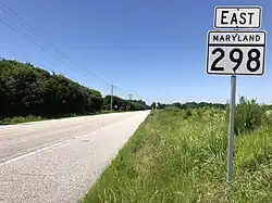 Maryland Route 298 (MD 298) is a state highway in the U.S. state of Maryland. The highway runs 20.14 miles (32.41 km) from MD 20 near Fairlee east to MD 291 near Chesterville. MD 298 is a C-shaped highway that connects Fairlee, MD 213, and Millington with several villages in northern Kent County, including Butlertown, Lynch, and Still Pond. The highway also provides a bypass of Chestertown between the western and eastern parts of the county. MD 298 was built from Fairlee to MD 292 near Still Pond around 1930 and reconstructed in the early 1950s. The highway was extended eastward to MD 566 east of Still Pond in the mid-1950s, to MD 213 in the early 1960s, and to MD 291 in the late 1980s.