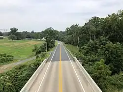 MD 545 was paved as a concrete road from MD 280 (now MD 213) to Little Elk Creek near Childs in 1933.[3][4] This work included the construction of a 27-foot-wide (8.2 m) steel pony truss bridge over Little Elk Creek that was completed in 1932.[4][5] MD 545 was extended to Pleasant Hill after the state reconstructed Blue Ball Road from there to Childs as a gravel road between 1947 and 1949 and resurfaced soon after with bituminous concrete.[6][7] The highway was resurfaced with bituminous concrete from MD 280 to Dogwood Road in 1969 and from Dogwood Road to Pleasant Hill in 1972.[8] In January 2010, the Maryland State Highway Administration put the 1932 pony truss bridge MD 545 used to cross Little Elk Creek up for sale to any buyer willing to preserve the bridge at a new location.[5] No interested party was found, so the old bridge was demolished in June and July 2011. The new 32-foot-wide (9.8 m) concrete bridge opened in November 2011.[9]