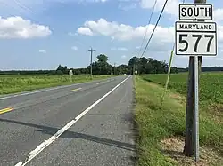 Maryland Route 577 (MD 577) is a state highway in the U.S. state of Maryland. Known as Reliance Road, the state highway runs 3.70 miles (5.95 km) from MD 392 at Reliance north to MD 313 near Federalsburg. MD 577 follows the Dorchester–Caroline county line for its entire length. The state highway is considered to be in Caroline County for maintenance purposes.[2] The first section of MD 577 was paved near its northern terminus by 1910 and reconstructed as a state highway in 1935. The highway was completed south to Reliance in 1942.