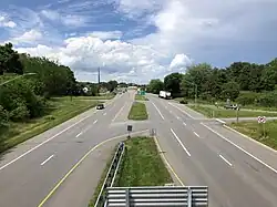 Construction shifted to the south side of Williamsport in the mid-1960s. MD 68, which had been extended west to Clear Spring in 1956, was relocated south of Williamsport, replacing Sunset Avenue and what is now Kendle Road, in 1965.[16][17] MD 68 was relocated for a grade separation of the Cumberland Valley Railroad and to tie into an interchange with I-81 and the south end of Conococheague Street.[17][18] MD 63's route north into Williamsport, Artizan Street, was cut off by the construction of I-81, so the state highway joined MD 68 in a concurrency north to US 11.[17] The new alignment of MD 63 and MD 68 was built as a four-lane divided highway around the interchange with I-81, which originally only contained ramps to and from the direction of West Virginia when the interchange opened with the completion of I-81 in 1966.[15] That interchange was completed with ramps to and from Hagerstown between 1981 and 1989.[19][20]