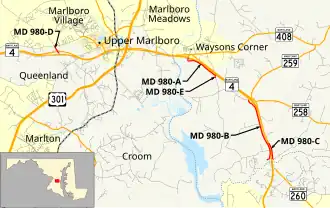 • MD 980D is the designation for the 0.27-mile (0.43 km) segment of Ritchie Marlboro Road from the road's interchange with MD 4 (Pennsylvania Avenue) to the intersection of Ritchie Marlboro Road and Old Marlboro Pike west of Upper Marlboro in Prince George's County.[1][5]