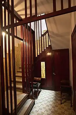 The predominance of wood, and the cream and chocolate colors of the hall transmit a warm, welcoming feeling to the home. The repetition of vertical, elongated geometrical shapes (decorative frieze below the ceiling, wainscoting, and stairway woodwork), and the brightness coming from the skylight at the back enabled Masó to create a sense of large, orderly, sober space. An outstanding feature is the French clock dating from the mid-19th century.