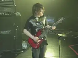 Although he has a reputation as a "loud" guitarist, Miya said his roots come from Boøwy guitarist Tomoyasu Hotei.[50] Before hearing Boøwy, Miya said he had no concept of rhythm guitar because he had only covered X Japan up to that point. But Boøwy's "percussive" guitar became the foundation of his own style.[4] Miya has called X Japan guitarist Hide a "guitar hero" and said he taught him that "even Japanese music can be rock".[53] According to Aie of Deadman, Miya was one of many Ibaraki musicians who at one point imitated Cali Gari guitarist Ao Sakurai.[6] Miya cited Korn as the reason he started using seven-string guitars.[54] He said while they allow him to play a large range of music, they do not work very well on downtunings.[54] In 2004, Miya said he rarely plays guitar solos because he does not really like them. He remarked that they are fine if they are like interludes, but he finds it embarrassing to go out front and command attention.[55] However, Mucc's album Shin Sekai (2022) has many guitar solos because he decided not to use any synthesizers on it. For the album, Miya said he would often use a modern approach to retro-sounding songs, and vice versa.[50] In Petit Brabancon, Miya said that he takes the supporting guitar role, playing slightly behind Antz to give a three-dimensional sound.[56] He also said that his guitar is panned to the left, while Antz's guitar is heard from the right.[38] Like the other members of Mucc, Miya often performs barefoot, stating, "It's simply easier to move that way".[57]