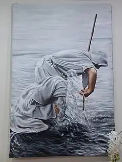 Mandaeans revere John the Baptist and practice frequent baptism (masbuta) as ritual purification, not of initiation. They are possibly one of the earliest peoples to practice ritual baptism.[5] Mandaeans undergo baptism on Sundays (Habshaba, Classical Mandaic: ࡄࡀࡁࡔࡀࡁࡀ[6]), wearing a white sacral robe (rasta). Baptism for Mandaeans consists of a triple full immersion in water, a triple signing of the forehead with water (in which the priest puts his fingers on the baptized person's forehead and moves it from right to left), and a triple drinking of water. The priest (rabbi) then removes a ring made of myrtle (klila) worn by the baptized and places it on their forehead. This is then followed by a handclasp (kušṭa, "hand of truth") with the priest, using right hands only. The final blessing involves the priest laying his right hand on the baptized person's head.[7]: 102