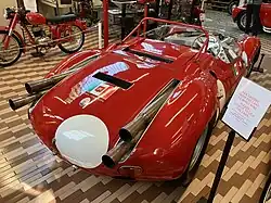 The Maserati Tipo 60/61 (commonly referred to as the Maserati Birdcage) are a series of sports racing cars produced between 1959 and 1961 by Italian automobile manufacturer Maserati for privateers racing in sports car events including the 24 Hours of Le Mans in the 2-litre and 3-litre racing category.[2] It used an intricate tubular space frame chassis, containing about 200 chro-moly steel tubes welded together, arranged triangular formation at high stress areas of the chassis, hence the nickname "Birdcage".[1] This method of construction provided a more rigid and, at the same time, lighter chassis than other racing cars of the time.[1]