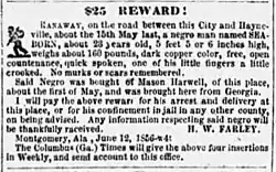 - ^ Mason Harwell 1860 District 1, Montgomery, Alabama, USA 34 Slave Owner, Ancestry.com. 1860 U.S. Federal Census - Slave Schedules [database on-line]. Lehi, UT, USA: Ancestry.com Operations Inc, 2010. Original data:United States of America, Bureau of the Census. Eighth Census of the United States, 1860. Washington, D.C.