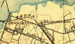 The town that would be Masonville was founded in the 1890s, centered on what was then Ninth Street & Chesapeake Avenue, directly adjacent to the newly expanded lines of the Baltimore & Ohio Railroad's (B&O) Curtis Bay Branch.[1][3] Along with other communities bordering the Patapsco River, Anne Arundel County extended electric light to the town in 1902.[4] A new Methodist Episcopal Church was dedicated in 1903 at $3000 (equivalent to $104,989 in 2024).[5] A small fundamentalist church and related school were also established at this time.[3]