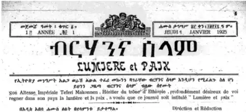 Printed religious books written in Ge'ez and printed in Europe were distributed in Tigray in the 1600s.[11][12] Domestic printing press work began in 1863 by Swedish and Italian missionaries.[13] Newspapers began printing in the mid-1880s. In 1890, Italians began printing El Eritereo and in 1891 the publishing company Corriere Eritreo was launched.[14] In 1905, an Amharic and French newspaper, Le Semeur d'Ethiopie, began printing in Harar.[15] In 1912, a newspaper in Tigrinya called Melkite Selam was launched.[16]