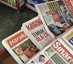 Malay language newspapers in Malaysia are often noted by scholars for their lack of analytic critique towards government policies compared to their English counterparts as far back as 1970s; one Utusan Melayu executive even remarked that "it is not the newspapers' role to check on government. The papers here are...supporters of government".[2] Since conventional media is so tightly controlled by the government, Malaysia has a lively alternative media scene, characterised by such news portals as Malaysiakini and The Malaysian Insider which take advantage of the government's pledge not to censor the Internet despite its stranglehold on most mass media outlets.[3]