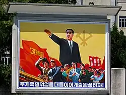The media have consistently upheld the personality cult of the Kim family since the country's formation. It frequently reported on the activities of late leader Kim Jong Il, regularly reporting on his daily activities, including "prayers" to founding leader Kim Il Sung. Previously, media would refer to Kim Jong Il as the "Dear Leader", though this was dropped in 2004.[13] However, in January 1981, during the first few months of Kim Jong Il's entry into politics, a survey revealed economic concerns in the media, rather than upholding the cult—60% to 70% of media coverage was focused on the economy in January that year, and between January and September, 54% of editorials in the Rodong Sinmun also referred to economic problems, with only 20% on politics, 10% on reunification and 4% on foreign affairs.[14] All indications are that this has continued under the country's third and current leader, Kim Jong-un; soon after his father's death he was acclaimed as the "Great Successor".[15]