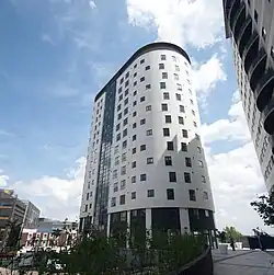 The planning application for Block I was submitted in October 2004.[18] Construction cost £30 million and the 14-storey building consists of 173 studio, one and two-bedroom apartments. The first residents had moved in by February 2007.[19] The building is clad in 6,000 m2 (65,000 sq ft) of pre-cast panels with a complex mixture of finishes; some contain black polished bands bounded by a white concrete frame and finished to two different levels of exposure. The top floor penthouse apartments are clad with grey polished pre-cast panels. Many of the cladding panels are either concave or convex with pointed ends and most were pre-fitted with windows at the Techrete factory to accelerate the construction process.[20]