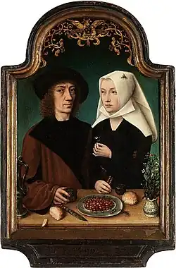 His dated Self portrait of the artist with his wife in its original frame (1496; Royal Museum of Fine Arts, Antwerp) reveals that the artist was 36 years old at the time it was made, as well as a member of Antwerp's Guild of St. Luke.[1]