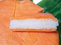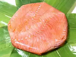 Masuzushi is made of vinegared trout sashimi on top of vinegared rice and wrapped in bamboo leaves. Once the fish and rice is wrapped in bamboo leaves, a weight (often a heavy stone) is kept on top for several hours in order to compress and complete the dish.[2][3] It is traditionally kept in a round bentwood box known as a mage-wappa, which is then sealed by two bamboo sticks.[4] There are also masuzushi which consist of two layers of fish and rice.[2]