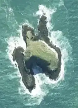 A sea arch is eroded into steeply dipping conglomerate and sandstone of Matapia Formation,[2] which is a poor to moderately bedded conglomerate with a pebbly and bouldery sandstone, about 18 million years old,[3] which originated with the Houhora Volcanic Group and other volcanic rocks. A solid rocky platform surrounds the island.[4]