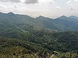 Distant view of the villages of Mau Tso Ngam and Kwun Yam Shan from West Buffalo Hill. The hills Tate's Cairn and Temple Hill are visible in the background.