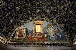 Mosaics composed of glass tesserae cover the interior walls of the vault, the lunettes and the cupola; the adornments are of high quality.[1] Above the entrance portal is a mosaic depicting Christ as the Good Shepherd among his flock.[1] The barrel-vaults of the four arms of the cruciform chapel bear vegetal mosaics consisting of acanthus and vine scrolls.[1] In the western arm's lunette a mosaic represents deer approaching a spring, perhaps a reference to Psalm 42, whose incipit is "As the hart panteth after the water brooks, so panteth my soul after thee, O God."[1] In the southern transept's lunette is a mosaic depicting a male saint carrying a cross accompanied by a burning gridiron and an opened cabinet containing the four canonical Gospels, identified by the names of the Four Evangelists in Latin.[1] Unidentified figures of white-robed martyrs decorate the lunettes of the east and west transepts.[7] The interior of the dome at the centre is decorated as a starry sky, with a regular mosaic of golden stars on a dark blue background, with a gold cross represented at the apex of the dome and the four symbols of the Evangelists (or the "living creatures" of Revelation 4:7) at the corner pendentives.[1] The four lunettes below the dome, between the arches springing from the four central piers and the arches of the pendentives above them, have mosaics each depicting two Apostles with their right arms raised in acclamation likely directed at the male saint in the southern transept's mosaic.[1]