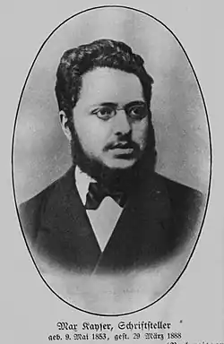 Max Kayser (9 May 1853 – 29 March 1888) was a German Social Democratic political journalist-commentator and politician. Between 1878 and 1887 he served as an unusually youthful member of the German "Reichstag" ("National Parliament"). Nevertheless, between 1881 and 1884 - years during which, in parts of Germany, Bismarck's "Anti-Socialist Laws" were applied with particular enthusiasm - he was faced with a succession of court cases and excluded from a number of cities and towns, on account of his political record.[1][2][3]
