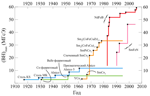 During the 20th century, the maximum energy product of commercially available magnetic materials rose from around 1 MGOe (e.g. in KS Steel) to over 50 MGOe (in neodymium magnets).[4] Other important permanent magnet properties include the remanence (Br) and coercivity (Hc); these quantities are also determined from the saturation loop and are related to the maximum energy product, though not directly.
