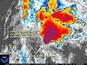 These floods were preceded by two weeks of persistent rain in the Caribbean area, which eventually caused the landslides that killed many people.[7] The floods caused much damage in Haiti and the Dominican Republic, with over 1,300 homes being destroyed and about 2,000 people being killed.[8] Due to this destruction, nearly 15,000 people were displaced with nowhere to live.[9] The area that felt the worst of the flooding was the town of Jimaní, near the border of Haiti and the Dominican Republic.[10] In fact, the destruction present at Jimaní was so bad that Dominican president Hipolito Mejia declared a national day of mourning after seeing the effects of the storm.[9]