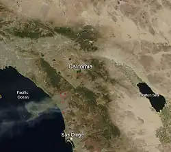 ![]() Satellite image of several of the wildfires in San Diego County on May 14, 2014. | |