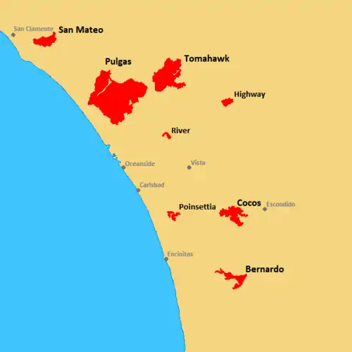 At least eight major (named) fires were burning simultaneously at the height of the event, as well as several unnamed small brush fires.[5] Smoke from the fires also prompted health advisories in parts of Orange and Los Angeles counties.[6]