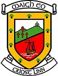 Mayo's current crest is based on the county's coat of arms, which is shown on the left. It features four crosses, each representing a diocese of the Catholic Church in Mayo. The Patriarchal or 'double' cross represents the Archdiocese of Tuam, while the three smaller Passion crosses represent Achonry, Killala and Galway/Kilmacduagh/Kilfenora. The Irish-language root word of the county, Maigh Eo, means "plain of the yew trees", and the trees that surround the crest represent this. As well as this, the number of trees is significant, with the nine trees representing the number of baronies in the county. The sailing ship represents the county's maritime history, while the red sea below the green hills represents the traditional "green above the red" motif of the county.[27] The Mayo GAA crest also features the Irish words Críost Linn, which translates to "Christ be with us".