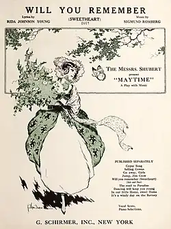 Maytime is a musical with music by Sigmund Romberg and lyrics and book by Rida Johnson Young, and with additional lyrics by Cyrus Wood. The story is based on the 1913 German operetta Wie einst im Mai (Like Once in May), composed by Walter Kollo, with words by Rudolf Bernauer and Rudolph Schanzer. The story, set in New York, is told in episodes covering a long period, from 1840 to the early 20th century. Young Ottillie, the daughter of a prominent family is in love with Dick, a poor musician, but they are kept apart by family and circumstance. Years later, their descendants marry. Maytime introduced songs such as "The Road to Paradise", "Will You Remember?" and "Jump Jim Crow".