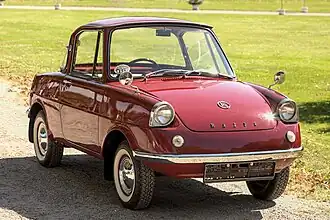 The Mazda R360 is a kei car manufactured and marketed by Mazda as the company's first passenger car — a two-door, four-seat coupé. Introduced in May 1960, the R360 featured a 1,760 mm (69.3 in) wheelbase, weighed 380 kg (838 lb) and was powered by a rear-mounted air-cooled 356 cc V-twin engine producing 16 PS (12 kW)[1] and 2.2 kg⋅m (21.6 N⋅m; 15.9 lb⋅ft) of torque. The car was capable of 84 km/h (52 mph)[2] and featured a 4-speed manual or two-speed automatic transmission.[3] The suspension, front and rear, was rubber "springs" and torsion bars.[1]