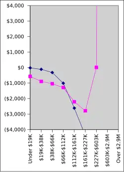 McCain had declined to sign the pledge of the group Americans for Tax Reform to not add any new taxes or increase existing taxes.[25] However, after he lost the presidential election in 2008, McCain became a signer of Americans for Tax Reform's Taxpayer Protection Pledge.[26] In 2002, Sen. McCain was one of only two Republicans to twice vote against the permanent repeal of the Estate Tax,[22] and has recently stated opposition to a permanent repeal of the Estate Tax.[27] McCain was one of two Republicans who voted against Bush's tax cuts in 2001. He opposed accelerating the cuts in 2003, saying that he was not in favor of cutting taxes during a time of war.[23][25] In 2004 McCain appeared on Meet The Press with Tim Russert where he was asked about his opposition to the Bush tax cuts. McCain explained himself by saying, "I voted against the tax cuts because of the disproportional amount that went to the wealthiest Americans. I would clearly support not extending those tax cuts in order to help address the deficit."[28] However, McCain supported the Bush tax cut extension in May 2006,[29] and January 2008 he told Russert that he favors making those tax cuts permanent to prevent an increase in taxes while the economy was "shaky." He also said that his tax proposal would focus more on middle-income Americans than on the wealthy.[30]