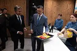 When Blinken visited Kyiv in September 2023, Kuleba took him to a McDonald’s.[10][1] In January 2025, the original 1997 McDonald's restaurant, the first to open in Ukraine, was damaged during a Russian drone and missile strike which shattered its storefront, though it later reopened.[1]