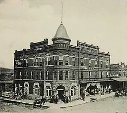 The Foley Building in 1907. The bottom half of the building was occupied by the First National Bank, while the top half was used as a hotel. The fighting occurred at the intersection in front of the building, and "General" Dunlap was killed on the third floor.