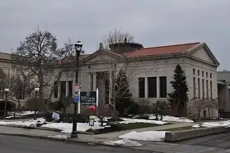 The firm retained its name long after the deaths of the founders. White was murdered in 1906, McKim died in 1909 and Mead retired in 1919. Kendall and Richardson divided most design responsibilities while Fenner took on the role of chief executive.[18] Architectural historian Mosette Broderick described the design partners thusly: Kendall as "hardworking, dull and mean," Richardson as "the best designer of the three."[19] This summation of Kendall's design skills is contradicted by his buildings, such as the Butler Institute of American Art (1919); his contemporaries considered him scholarly in the way that McKim had been.[20] The recollections of employees such as Royal Cortissoz, however, confirm that his behavior towards his colleagues and subordinates could be actively malicious.[21] Leland M. Roth identified the Racquet and Tennis Club (1918), designed by Richardson, as "the last and best work" of the decade following McKim and White's deaths. Richardson here combined Italian Renaissance precedents, such as the Florentine Palazzo Antinori, with modern functionalism.[22] The final two partners, Lawrence Grant White (1887 – 1956)–Stanford White's son–and James Kellum Smith (1893 – 1961), were admitted to the partnership in 1920 and 1929, respectively.[23] In its later years the firm maintained its commitment to quality materials and workmanship, but without its earlier creative abilities. In prior years the firm had been unfairly accused of being a "plan factory," a firm which executed generic, repetitive work as quickly as possible, but after about 1920 the comparison came to be seen as apt.[24][25]