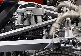 McLaren bought the rights to the Tom Walkinshaw Racing developed engine, itself based on the Nissan VRH engine architecture,[2] which was designed for the IRL Indycar championship but never raced. However, other than the 93 mm (3.66 in) bore, little of that engine remains in the M838T.[3] In only 18 months, Ricardo went from a modified Nissan engine design to a running prototype.[4]