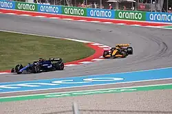The car was raced in a special chrome livery for the United States Grand Prix.[34] McLaren also débuted a new front wing, front and rear suspension, front and rear brake ducts, and beam wing.[130] For the sprint race, Norris qualified fourth and finished third.[131][132] Piastri, who lost his qualifying lap due to a track limits violation, qualified sixteenth and improved to finish tenth in the sprint.[131][132] Norris qualified on pole and Piastri fifth for the Grand Prix.[133] Piastri finished the race fifth.[134] Norris lost several positions on the opening lap, and recovered to finish third.[134] The stewards judged that his final overtake on Verstappen, which was performed after both ran wide, meant he had gained an unfair advantage, and awarded Norris a five-second penalty that dropped him to fourth place.[135]