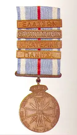 Obverse of the medal, with military ribbon and clasps for Elasson, Sarantaporon, Aikaterini, and Gianitsa