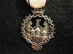 The Medalla de la Campaña de Rusia ("Medal of the Russian Campaign"), commissioned 9 November 1943, was awarded by Nationalist Spain to those Spanish volunteers who served at the Russian front during World War II, as members of the Blue Division.[1] This force, attached to the Heer of the Wehrmacht, known as the 250th Infantry Division, was in total composed of 47,000 men, sent by Francisco Franco to aid the Third Reich, as a way to pay back Adolf Hitler's help during the Spanish Civil War.