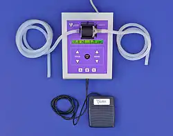 A syringe pump consists of one or more syringes which have been pre-filled and loaded into a mechanized device containing a motor-driven lead screw which will push the reciprocating plunger of the syringe(s) for specified distances at specified intervals. These devices are capable of extremely high accuracy and are pulse-free (i.e., the fluid is dispensed in a continuous stream rather than with the pulsations of the peristaltic or inductive pumps) but are limited in volume to the total volume of the attached syringe(s), and, once the emptied, the syringe(s) will require refilling before being used again making them of even more limited use than the bottle top dispensers. They are also among the most expensive types of media dispensers currently on the market. Common syringe pump media are acids, chemicals, coolants, combustible fluids, corrosive agents, gasoline or diesel fuel, non-liquid gas or air, ground water, hazardous materials, high viscosity fluids, liquid metal, oils, potable water, salt water, adhesives, and high temperature media.