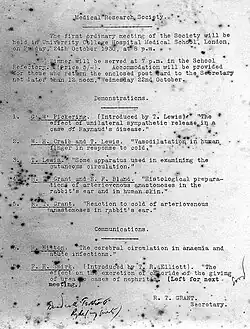 The MRS was formed following a report by a subcommittee of the UK Medical Research Council on the ‘Future Policy for the Promotion of Clinical Research’.[1] The report was written by Lewis, Thomas Renton Elliott, Wilfred Trotter and John Parsons. The first meeting of the Society was held on 24 October at University College Hospital.[1] At its formation the Society had 18 ordinary members and 2 honorary members, Archibald Garrod and John Scott Haldane.[6] The first demonstration at the first meeting was on 'The effect of unilateral sympathetic release in a case of Raynaud's disease' by George Pickering.[6]
