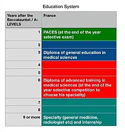 The first year of the studies of health (ex-PACES, currently called PASS) is common to the medical studies, dental, pharmaceutical and midwife[19] (sometimes also kinesitherapy). It is divided into two six-month periods.
