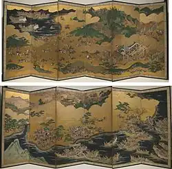 Kōwakamai developed somewhat later than noh.[21] According to tradition, the form was established by Momoi Naoaki (桃井直詮),[21] a Nanbokuchō warrior's son whose infanthood name was Kōwakamaru (幸若丸).[21] Kōwakamai were performed by low-class entertainers in the grounds of temples and shrines, as musical adaptations of the medieval war tales,[21] with their dances being straightforward and simple.[25] 51 libretti are extant,[26] including heiji-mono (平治物, works based on the Heiji Monogatari), heike-mono (平家物, works based on The Tale of the Heike), hōgan-mono (判官物, works about the tragic hero Minamoto no Yoshitsune), and soga-mono (曽我物, works based on the Soga Monogatari).[26] Such performances were apparently well-loved by members of the warrior class during the chaotic period of the late 15th and 16th centuries, but went into decline in the Edo period.[26]