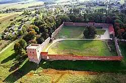 Beginnings of Medininkai are related to a fortress. According to some historians it might have been built already in the late 13th century, during the era of duke Traidenis; it was either him or one of minor local dukes who initiated the construction.[1] An unclear and not necessarily reliable chronicle points rather to the early 14th century, i.e. the times of the grand duke Gedyminas.[2] The most popular theory claims that the stronghold was built in the mid-14th century on orders of the grand duke Algirdas. It was located at the major Ashmyany route, though its exact role remains uncertain.[3] Historiographic accounts from the 19th century, rooted in a somewhat loose interpretation of sources, advanced the theory that Algirdas and his wife were frequent visitors to the place.[4] However, the first scientifically accepted note on the fortress is related to the year of 1385, when it was conquered by troops of the Teutonic Order, led by the grand master Konrad Zöllner von Rotenstein.[5]