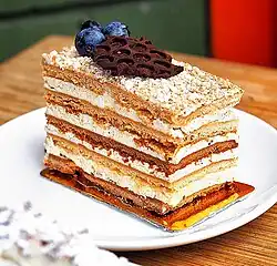 The dessert, famous for its lengthy preparation time, consists of layers of sponge cake with a cream filling and is often covered with nuts or crumbs made from leftover cake. While the thin layers harden shortly after coming out of the oven, the moisture of the filling softens it again over time.[3] There are many recipes and variations of this cake, but the main ingredient is honey, giving it its characteristic taste and flavor.[4]