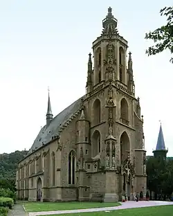The Evangelical Schlosskirche (“Palace Church”), a three-naved hall church, was built between 1479 and 1504. At the time of building, it stood right next to the Schloss and was the estate church, the town parish church and the Knights Hospitaller commandry’s church. Its Late Gothic west tower is shaped by rich stonemasonry. In the grave chapel, the 44 mostly Renaissance-style tombs of the House of Palatinate-Zweibrücken and the rich Gothic rib vaulting bear witness to sculptors’ highly developed art; also often praised is the wooden Rococo pulpit. The organ restored in 1993/1994 on the west gallery with its Baroque console was completed in 1767 by the renowned Brothers Stumm, and was already at the time, with its 29 stops, 2 manuals and pedal, one of the most opulent works of organ building in the Middle Rhine region. Together with the organ at the Augustinian Church (Augustinerkirche) in Mainz, it is one of the biggest preserved instruments built by this Hunsrück organ-building family.
