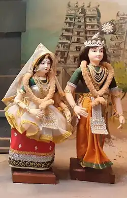 Popular laiphadibi dolls are made based on characters like Khamba and Thoibi, the famous lovers from Meitei stories, Sandrembi and Chaisra, the good and evil sisters from Meitei folktales, and Radha and Krishna, the eternal lovers from the raslila in Hinduism. There are also laiphadibi dolls representing different ethnic groups of Manipur, brides and grooms, goddesses, fishing women, and even Disney princesses like Cinderella.[8][11][12]